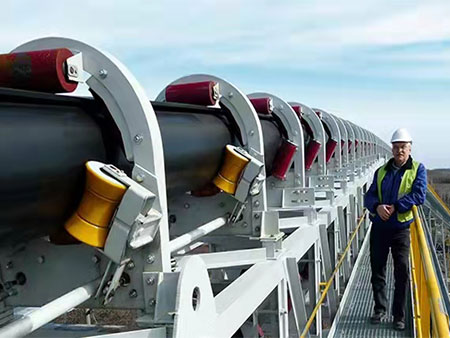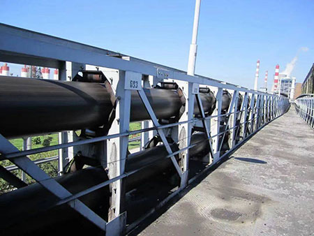 目前運用輸送帶輸送散裝物料絕大多數(shù)采用平帶輸送,平輸送帶鋪設在輸送機上,靠輸送機的側(cè)輥槽角自然成槽,承載著物料運行輸送。這種輸送結(jié)構(gòu)易使散裝物料粉塵飛揚、灑落,或含溶劑物料流淌,造成嚴重環(huán)境污染和物料損失。橡膠管狀輸送帶是管帶輸送機的主要配套設備,它是基于上述輸送缺陷,以整個輸送過程中輸送帶輸送物料時形成管狀,全程物料在密閉系統(tǒng)中輸送,實現(xiàn)小半徑空間轉(zhuǎn)彎、大傾角布置等技術(shù)特點,該項目也完全適應當前環(huán)保需求。